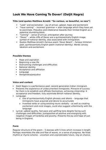 Look We Have Coming To Dover Daljit Nagra Poem Analysis Teaching Resources